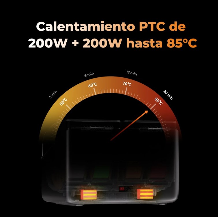 Potente calefacción PTC (200 W + 200 W) hasta 85 °C, ideal para filamentos técnicos como PA, PC o PA-CF.